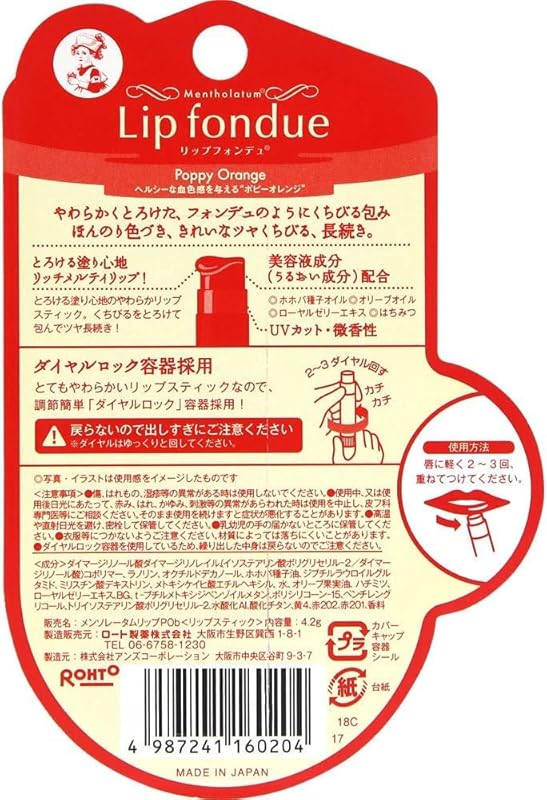 Discover the ultimate lip care experience with Mentholatum's Melty Lip Fondue in Poppy Orange. This innovative lip gloss stick combines the moisturizing benefits of a balm with the vibrant hue of lipstick, making it an essential addition to your beauty routine. Enjoy free worldwide shipping directly from Japan, along with a 1-month warranty for peace of mind. Enriched with natural oils like Jojoba and Olive, this luxurious formula hydrates while providing UV protection. Perfect for any occasion, this unisex lip fondue ensures your lips stay soft, healthy, and beautifully vibrant. Treat yourself to this must-have beauty staple today!