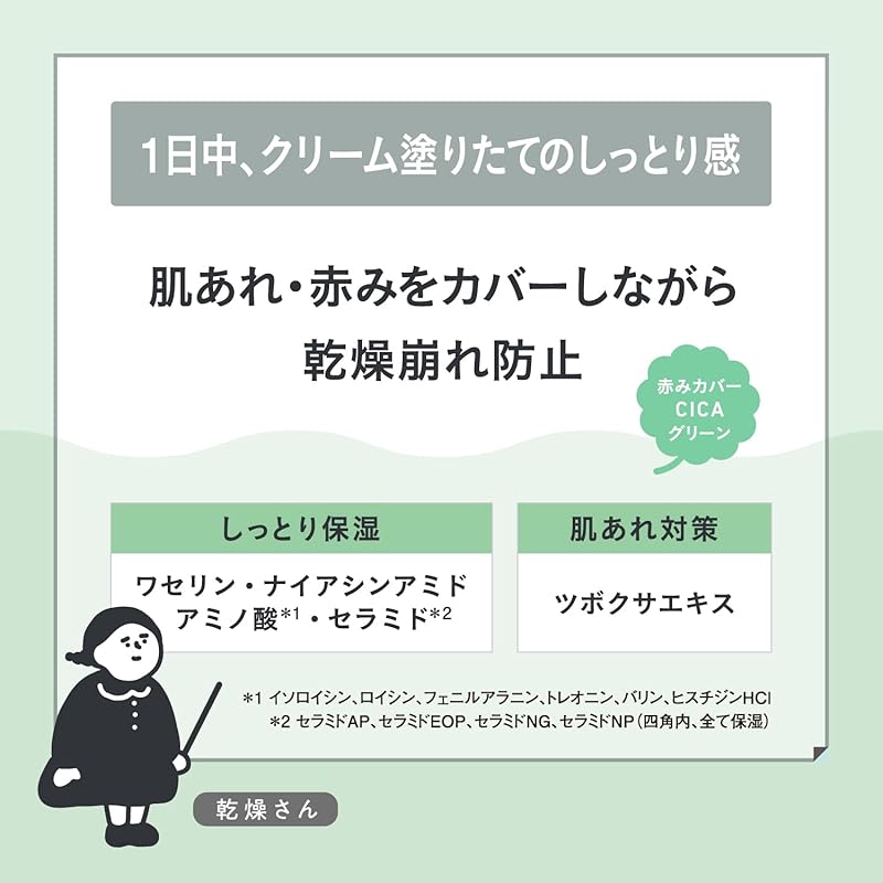 - Redness Coverage: The unique CICA Green component works to soothe irritated skin while effectively camouflaging redness.