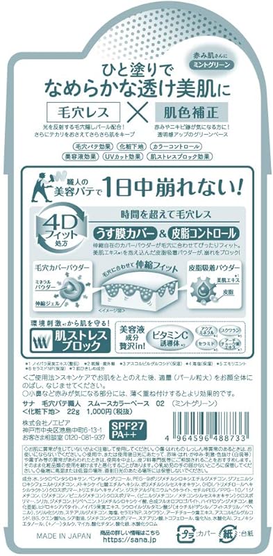 Elevate your makeup routine with the Perfect Pore Patcher Smooth Color Base 22g. This innovative mint green primer is expertly designed to blend seamlessly into your skin, providing exceptional pore coverage and color correction. Ideal for normal skin types, it features SPF 27 for sun protection and a lightweight feel that lasts all day. Shipped directly from Japan, this premium product comes with free worldwide shipping and a 1-month warranty for peace of mind. Perfect for both makeup novices and pros, it promises a velvety finish that enhances your skin's natural beauty. Experience flawless skin today!