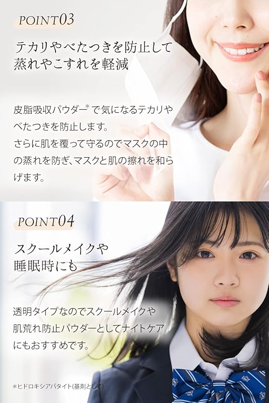 Designed for on-the-go beauty, the compact packaging includes a convenient mirror, making it easy to carry for touch-ups at school or during busy days. Simply apply a small amount of powder to areas prone to shine, such as the T-zone, to transform your skin into a velvety smooth canvas, free from the discomfort often caused by masks.