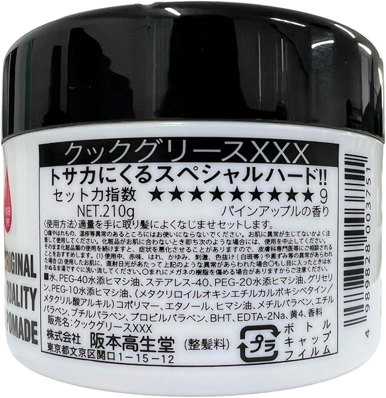 Introducing the 阪本高生堂 クックグリース XXX 210g パインアップルの香り, a premium hairstyling product by Fine Cosmetics. This water-soluble grease is expertly formulated to provide an exceptional hold, rated ★★★★★★★★★, making it ideal for achieving hard-set hairstyles. Its unique pineapple fragrance infuses your grooming routine with a refreshing tropical essence, perfect for those who desire both style and an uplifting aroma.