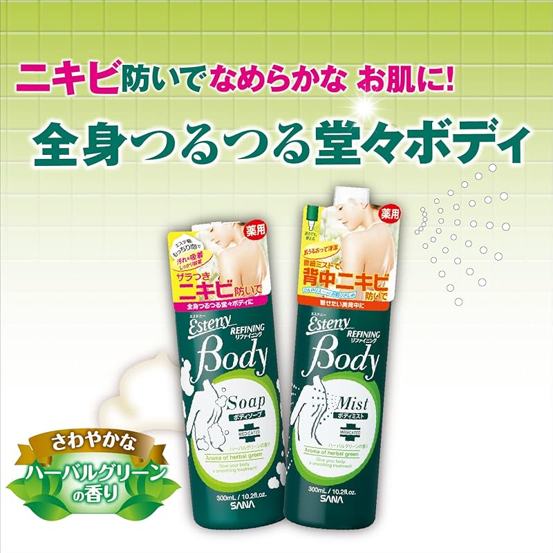 Discover the SANA Esteny Medicinal Body Mist AC, your go-to solution for back acne prevention. Formulated with powerful ingredients like salicylic acid and allantoin, this 300ml body mist not only tackles existing breakouts but also prevents future ones, ensuring smooth and healthy skin. Enjoy the refreshing herbal green fragrance while benefiting from its moisturizing properties. With free worldwide shipping and a 1-month warranty, this product ships directly from Japan, providing you with authentic skincare. Transform your routine into a spa-like experience and regain your confidence with clearer skin!