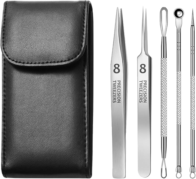 - Comprehensive Toolset: This 4-piece set includes precision tweezers, an acne needle, a bowl-shaped extractor rod, and a stylish storage case, ensuring you have everything needed for effective pore care.