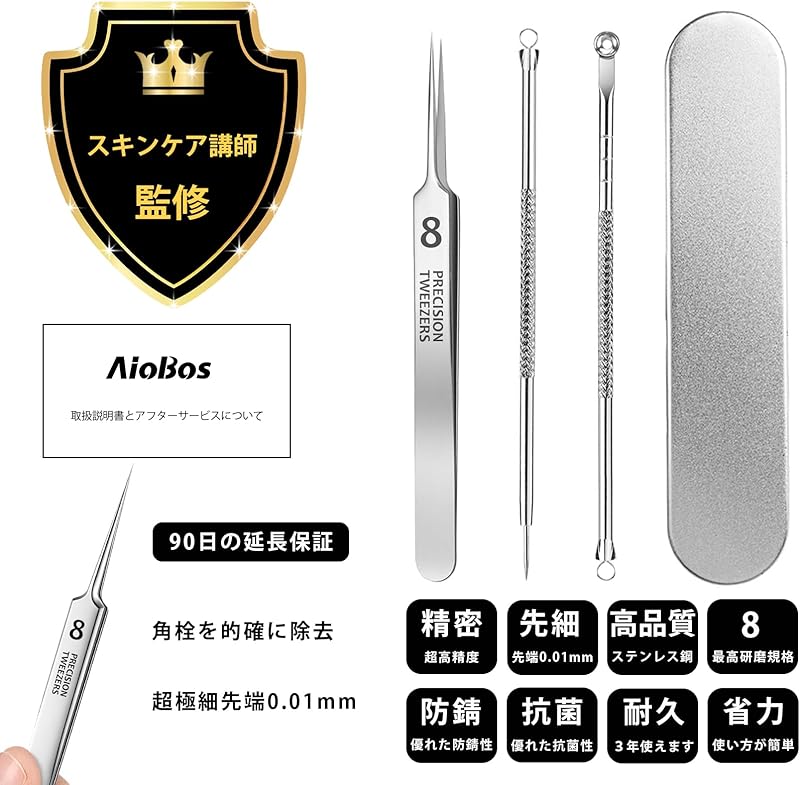 Discover the AioBos Precision Pore Care Tool Set, the ultimate solution for achieving flawless skin at home. This comprehensive 4-piece set, shipped directly from Japan, includes ultra-fine 0.01mm precision tweezers, an acne needle, and a bowl-shaped extractor rod, all designed to tackle stubborn blackheads and whiteheads effortlessly. Enjoy free worldwide shipping and confidence with a 1-month warranty, ensuring your satisfaction. Crafted from premium stainless steel for durability and precision, this kit is perfect for skincare enthusiasts of all levels. Elevate your skincare routine today with AioBos and experience the difference!