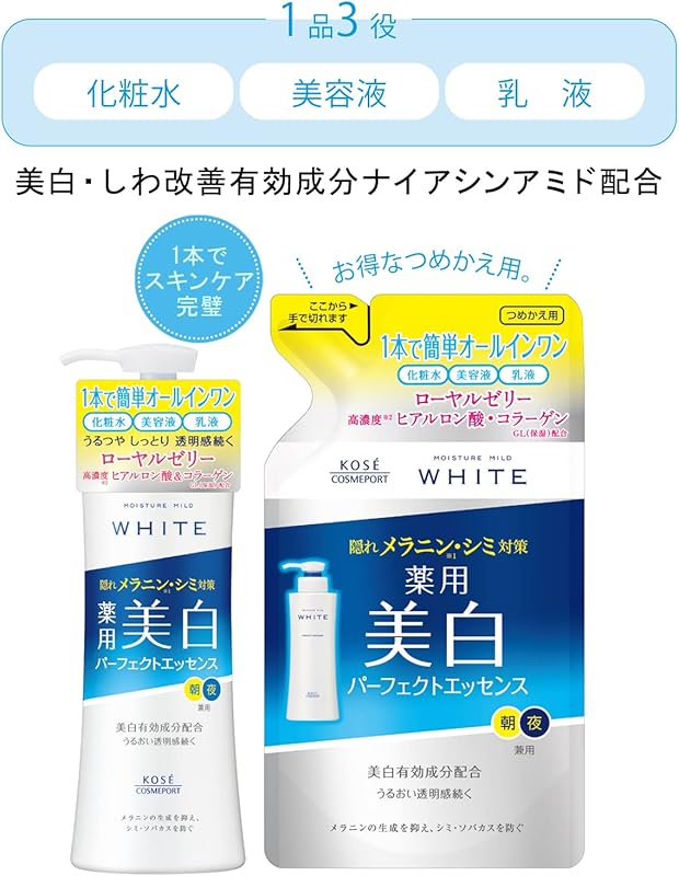 When considering your skincare options, the KOSE Moisture Mild White Perfect Essence stands out due to its multi-functional use—it acts as a toner, serum, and emulsion all in one. This versatility is particularly beneficial for those looking to streamline their skincare routine without sacrificing quality. Compared to other products that may only serve a single function, this essence simplifies your regimen while delivering comprehensive skincare benefits.