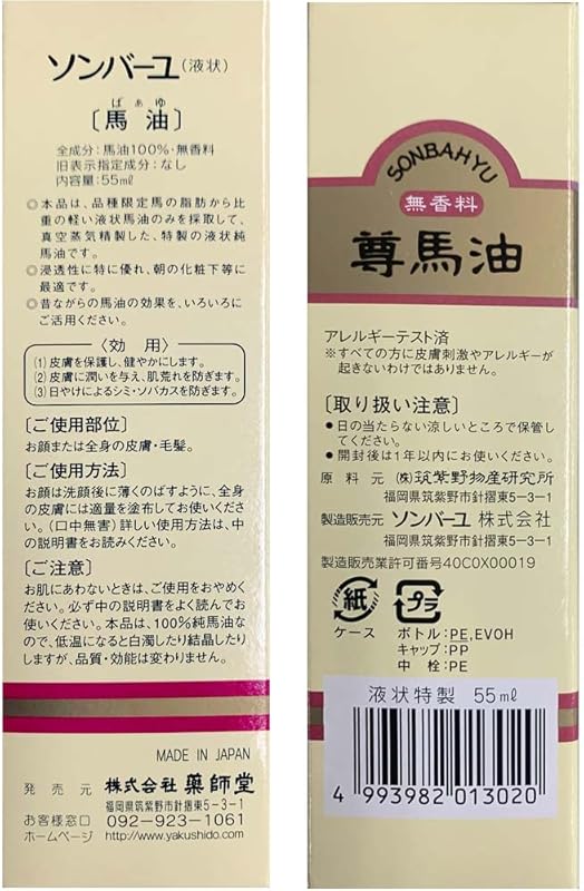 Experience the natural healing power of Sonbayu Unscented Horse Oil (55ml), a premium skincare solution shipped directly from Japan. This 100% pure horse oil is perfect for all skin types, including delicate skin for children aged 0-3. It deeply hydrates, protects, and nourishes, making it ideal for preventing dryness and alleviating irritation. Enjoy free worldwide shipping and a 1-month warranty for your peace of mind. Embrace the tradition of Japanese skincare and discover why Sonbayu is a favorite among parents and skincare enthusiasts alike. Treat your skin to the gentle care it deserves!