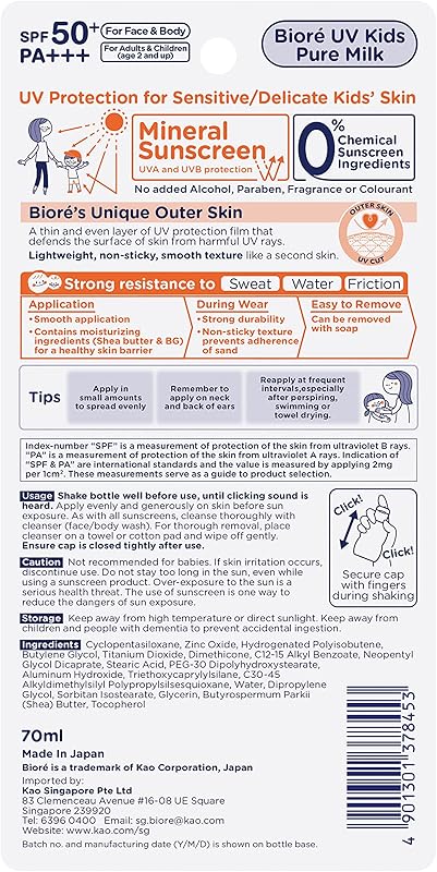 Biore UV Kids Pure Milk Sunscreen is formulated with key ingredients that ensure maximum sun protection and safety, including: