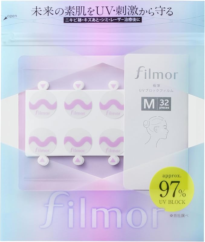 Introducing the Filmor UV Block Film Patch - Size M, a cutting-edge skincare solution meticulously designed to shield your skin from harmful UV rays. This innovative product also targets acne marks, scars, and sensitivities post-laser treatment. Each pack includes 32 transparent patches with a diameter of 15mm, providing precise coverage for those troublesome areas. With an impressive UV-blocking rate of approximately 97%, these patches ensure your skin remains protected against harmful sun exposure.