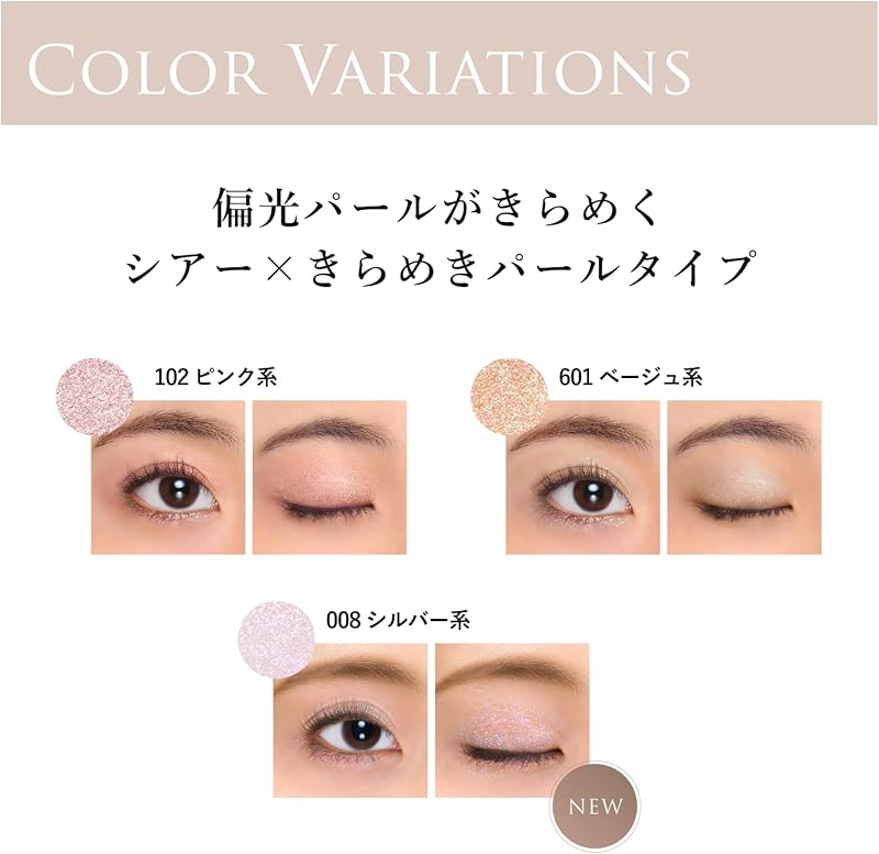 Choose between two captivating textures: the sheer type for a sparkling effect with large, iridescent pearls or the color and pearl combination that highlights your base shade, providing a striking impact. Tailor your eyeshadow experience to match your desired impression, whether you prefer a soft shimmer or bold brilliance.