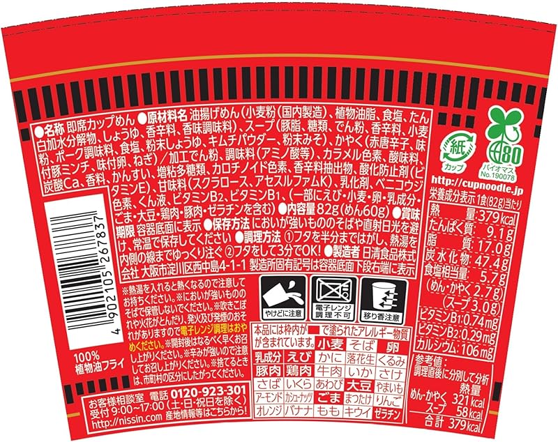 Each serving of Cup Noodles Spicy Flavor contains approximately 379 calories, along with a balanced mix of nutrients: 9.1g of protein, 17g of fats, and 47.4g of carbohydrates. Essential vitamins including B1 and B2 are also present, supporting your energy levels and overall health. Whether you’re seeking a quick meal after a workout or a filling snack, this cup of noodles delivers both taste and nutrition.