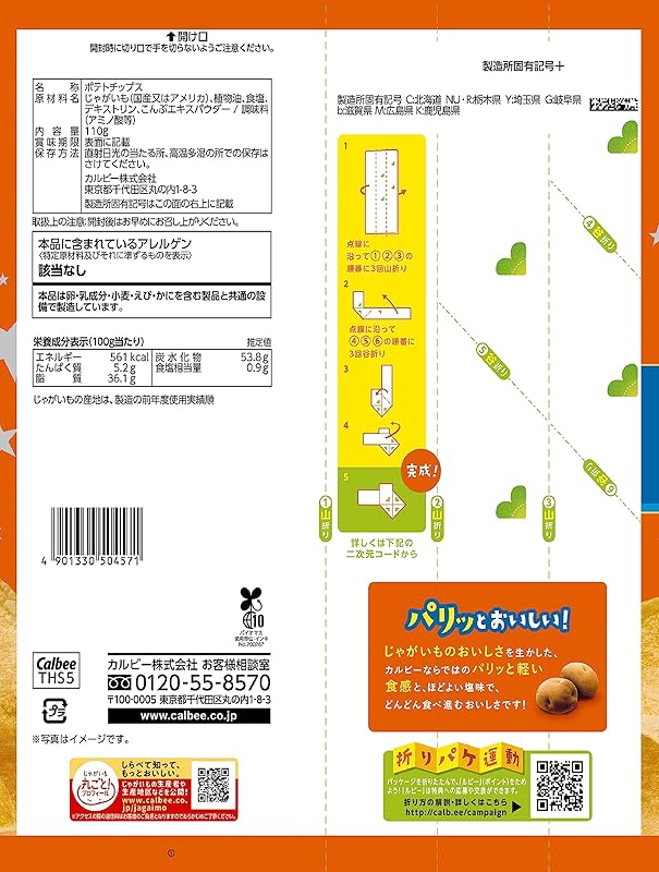 At Calbee, we prioritize quality. Our potato chips are made from the finest potatoes sourced from both Japan and America, ensuring a premium snacking experience. Each chip is cooked in plant oil and lightly seasoned with sea salt, complemented by a hint of kombu extract powder for a unique umami flavor. This commitment to quality means that every bite is wholesome and satisfying.