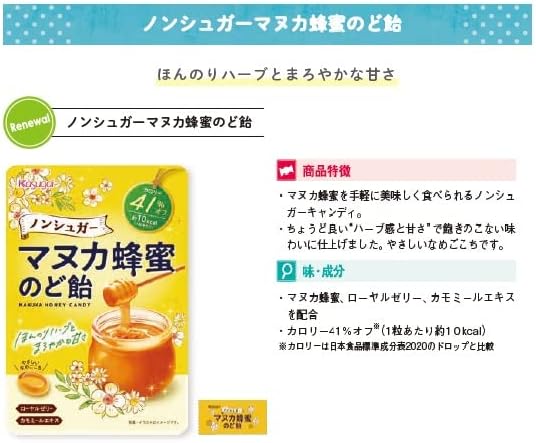 Discover the soothing relief of Harukigai Seika's Non-Sugar Manuka Honey Throat Drops (65g), expertly crafted in Japan. Perfect for those seeking throat comfort without added sugars, these delicious drops combine the rich flavors of maple and genuine Manuka honey, enhanced with calming chamomile and royal jelly extracts. Enjoy guilt-free indulgence with each drop! Plus, with free worldwide shipping and a 1-month warranty, you can shop confidently knowing you’re getting a premium product straight from Japan. Ideal for seasonal allergies or everyday discomfort, these throat drops are a must-have for your wellness routine!
