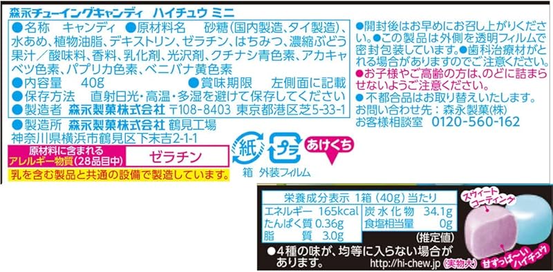 At Morinaga, quality is paramount. The Hi-Chew Mini is made with carefully selected ingredients, including sugar, glucose syrup, and natural fruit juices, ensuring an authentic taste experience. Each ingredient contributes to the delightful chewiness and vibrant flavors that have made Hi-Chew a beloved snack among candy enthusiasts. Enjoy the peace of mind that comes with knowing you are indulging in high-quality confectionery.