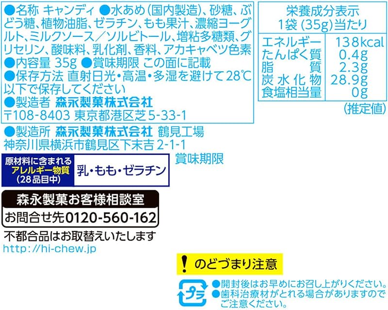 Morinaga emphasizes quality in every bite, evident in the carefully selected ingredients used in their Hi-Chew. This candy is made with domestic corn syrup, sugar, glucose, vegetable oils, gelatin, real peach juice, concentrated yogurt, and milk sauce. Committed to providing a genuine taste experience, Morinaga ensures that their products are free from artificial colors and unnecessary additives, allowing you to enjoy the pure essence of flavor.