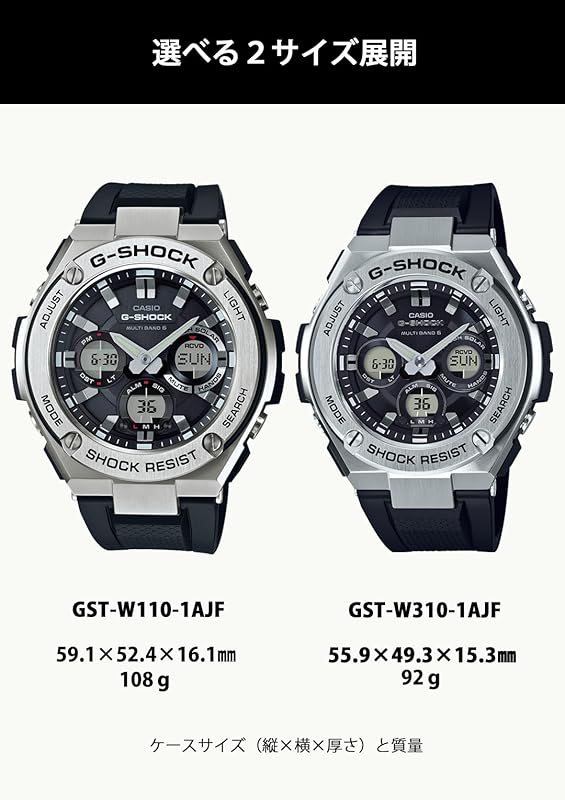 The G-SHOCK GST-W110-1AJF features a dual-layer bezel construction made from high-quality resin and fine resin, engineered to absorb shocks from impacts effectively. This advanced design not only enhances shock resistance but also allows for a versatile range of styles, making it suitable for any occasion—be it casual or formal. The watch’s robust build exemplifies Japanese craftsmanship, renowned for its meticulous attention to detail and quality.