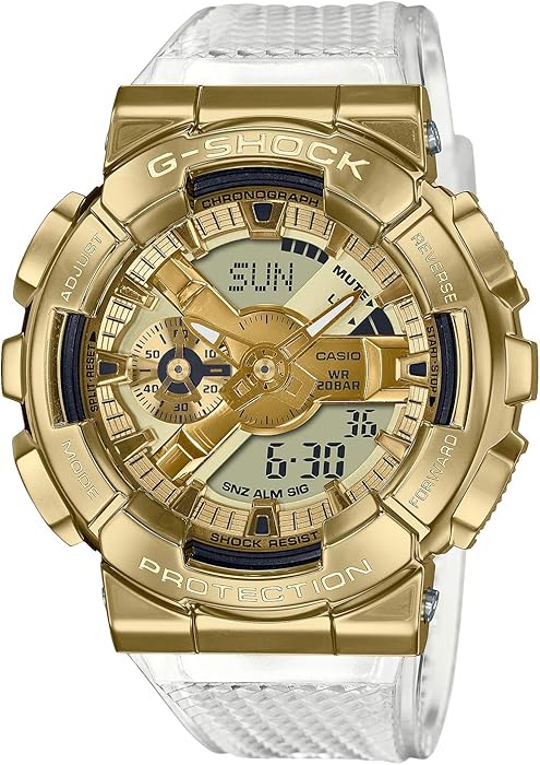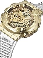 This model showcases a metalized bezel that not only enhances its robust character but also articulates a sophisticated aesthetic. The transparent clear resin band allows the shimmering gold elements of the watch to shine even brighter, creating a harmonious balance between rugged functionality and timeless elegance. The materials used reflect the high standards of Japanese craftsmanship, known for its attention to detail and quality.