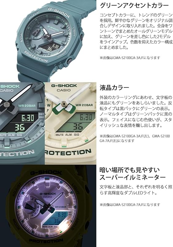 The GMA-S2100 series is distinguished by its sleek flat dial and simple bar indices that deliver a clean and minimalist look. The stylish green accents on the logo, indices, and LCD enhance its fashionable appeal, making it a perfect accessory for various casual outfits. This watch not only fulfills practical needs but also elevates your street fashion.