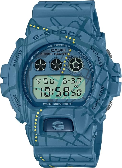 The DW-6900SBY-2JR showcases an eye-catching fusion of urban flair and practical functionality. Its striking design is adorned with a vivid map graphic that features intricate details, perfectly capturing the essence of Shibuya's bustling streets. This captivating visual extends across the bezel, band, and dial, creating a cohesive look that enhances your personal style and distinguishes you from the crowd.