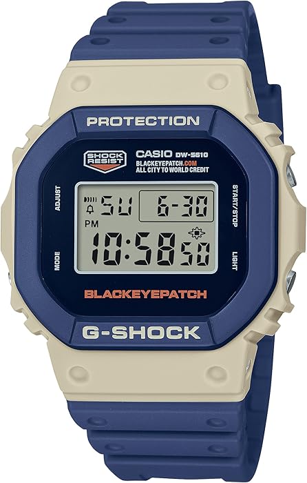 The DW-5610BEP-2JR draws inspiration from the original square-shaped DW-5610 model, captivating watch enthusiasts and fashion aficionados alike. Its striking navy and beige color palette is grounded in an industrial design ethos, adorned with vibrant orange accents typical of workwear aesthetics. The thoughtfully placed BlackEyePatch graphics infuse the design with an urban edge, ensuring that this watch stands out in any setting—from bustling city streets to stylish gatherings. This unique blend of color and graphic design exemplifies the innovation found in Japanese craftsmanship, where every detail is meticulously considered.
