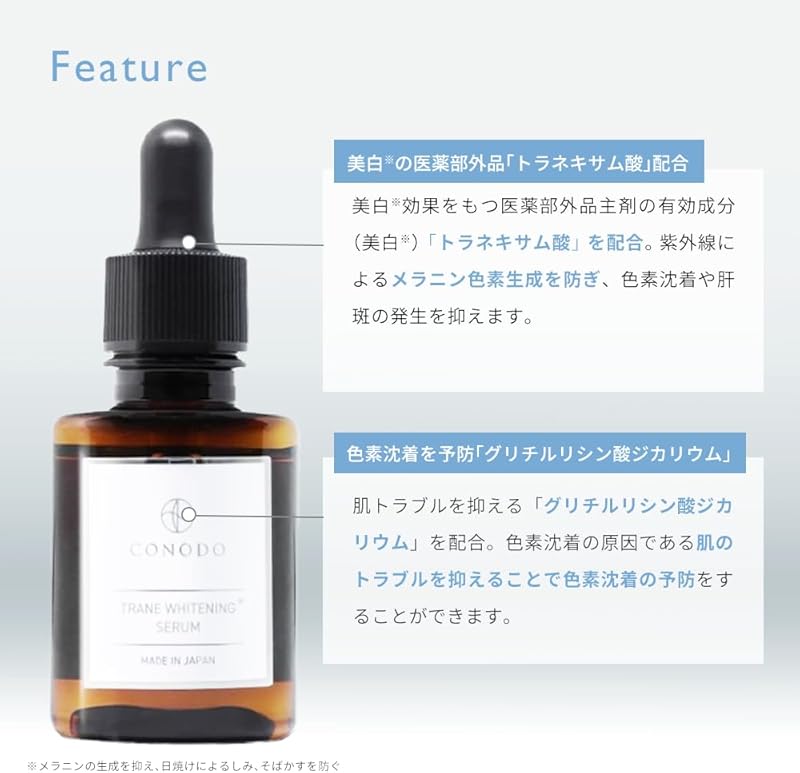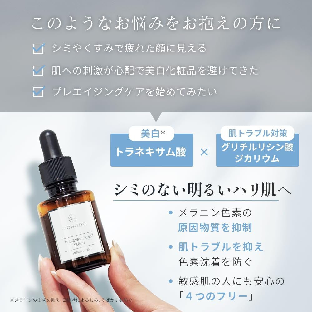 Unlock the secret to radiant skin with CONODO's Trane White Whitening Serum! This 30ml powerhouse features Tranexamic Acid to effectively reduce dark spots and pigmentation, promoting a luminous complexion for all skin types. Shipped directly from Japan, our serum combines natural ingredients like Job's Tears Ferment and Dipotassium Glycyrrhizate for deep hydration and soothing properties. Enjoy free worldwide shipping and a 1-month warranty, ensuring you experience the benefits worry-free. Say goodbye to dull skin and hello to your brightest self with a product crafted for your skincare journey. Transform your routine today!
