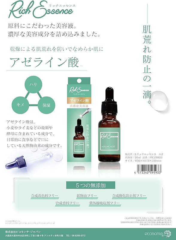 Experience the transformative power of Rich Essence Beauty Serum with Azelaic Acid, a premium skincare product by Picomonte Japan. This luxurious serum is designed to cater to your skin's unique needs, offering a blend of hydration, brightening, and anti-aging benefits. With its lightweight oil formulation and fragrance-free profile, it seamlessly integrates into your daily skincare routine, promising a radiant and youthful complexion.
