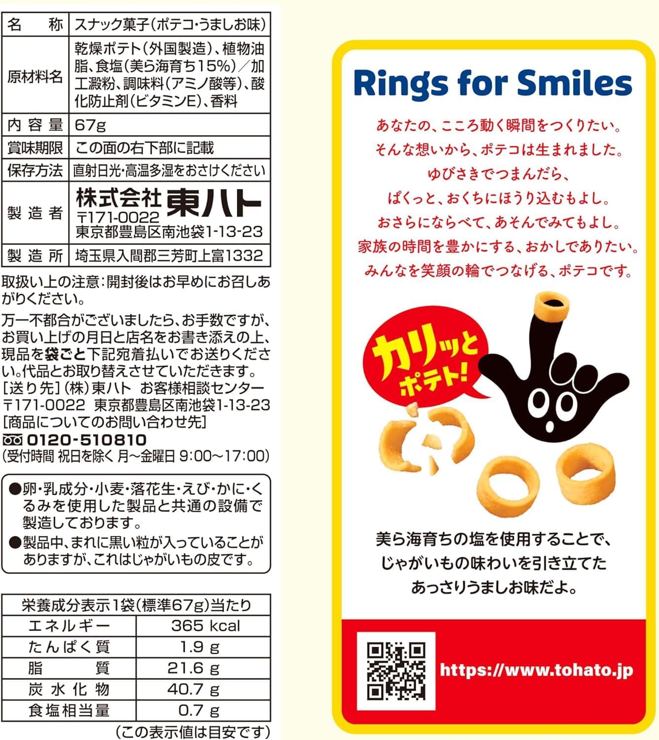 Discover the delightful crunch of Touhato's Delicious Umashio Flavor Potato Ring Snacks. Each bag contains 67g of perfectly shaped potato rings, designed for effortless snacking. With their irresistible texture and flavor, these snacks are sure to become a favorite, enticing you to reach for more with every bite.