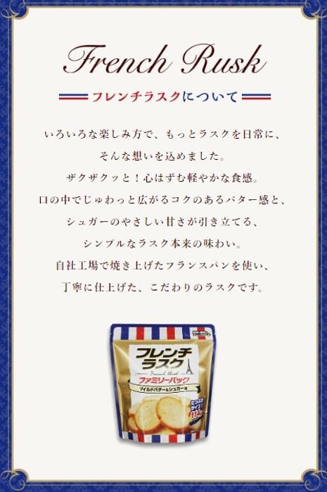 In Japan, the art of baking and snack making is taken very seriously, with a focus on quality ingredients and meticulous craftsmanship. The French Sugar Rusk embodies this philosophy, bringing together the best of Japanese baking techniques and flavors. Enjoying these rusks is not just about taste; it's about appreciating the dedication that goes into creating each bite-sized piece of joy.
