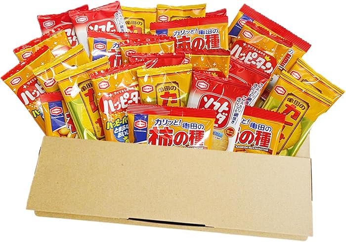 - 7 pieces of Mini Kameda's Kaki no Tane (9g each) - Crunchy rice crackers with a hint of soy sauce and a nutty flavor.