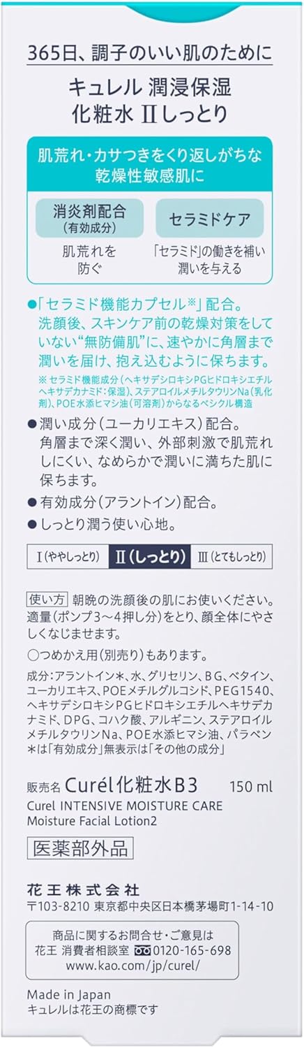 Discover the hydrating power of キュレル 化粧水 II (しっとり) 150ml, a gentle, alcohol-free lotion specifically designed for sensitive skin. This ultra-hydrating formula, enriched with eucalyptus extract, penetrates deeply to soothe dryness and maintain skin resilience against external irritants. Enjoy free worldwide shipping straight from Japan, and shop with confidence knowing your purchase is backed by a 1-month warranty. Perfect for all ages, this fragrance-free lotion is a trusted choice for those seeking soft, smooth skin. Embrace your skin's natural beauty with this premium product from a beloved Japanese brand, キュレル!