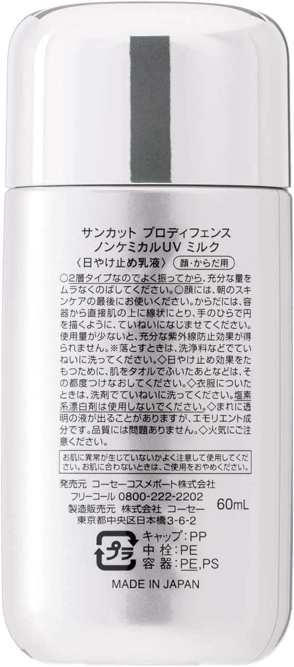 Discover the ultimate protection for your skin with the サンカット KOSE プロディフェンス ノンケミカル処方日焼け止め UV ミルク. This non-chemical sunscreen, enriched with SPF50+ PA++++, offers superior UV defense while being gentle on sensitive skin. With its unscented, paraben-free formula and water-resistant properties, it's perfect for daily use as a makeup base. Enjoy free worldwide shipping and a 1-month warranty on this high-quality product, shipped directly from Japan. Embrace radiant skin and safeguard your future with every application. Ideal for those seeking premium sun protection without harmful chemicals!
