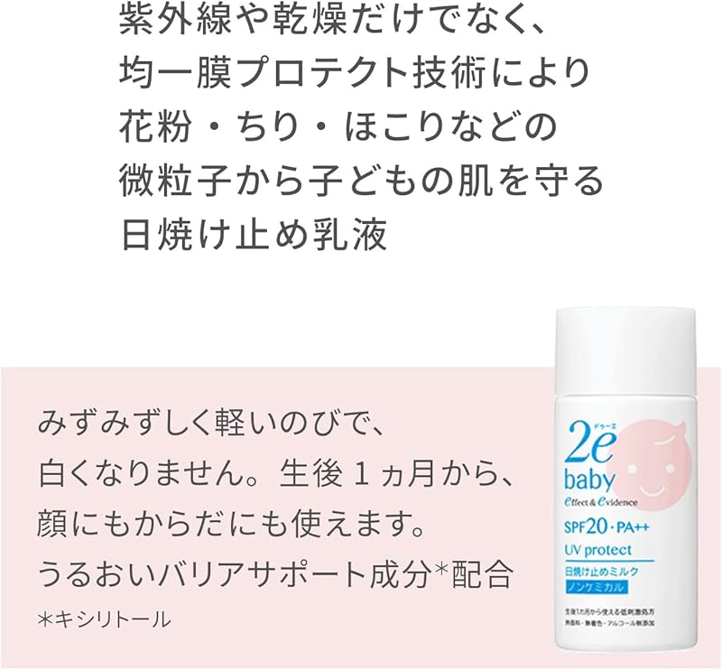 Introducing the 2e Baby Sunscreen Milk (40mL) from Japan, your go-to solution for safe sun protection for infants. Designed specifically for babies from one month old, this non-chemical sunscreen features an SPF of 20 and is suitable for all skin types. With its fragrance-free and low-irritant formula, it shields delicate skin from harmful UV rays while keeping it hydrated. Enjoy free worldwide shipping, and rest assured with our one-month warranty. Trust in a product crafted in Japan, ensuring quality and safety for your little one. Shield their skin with care – the 2e Baby Sunscreen Milk is here for your family!