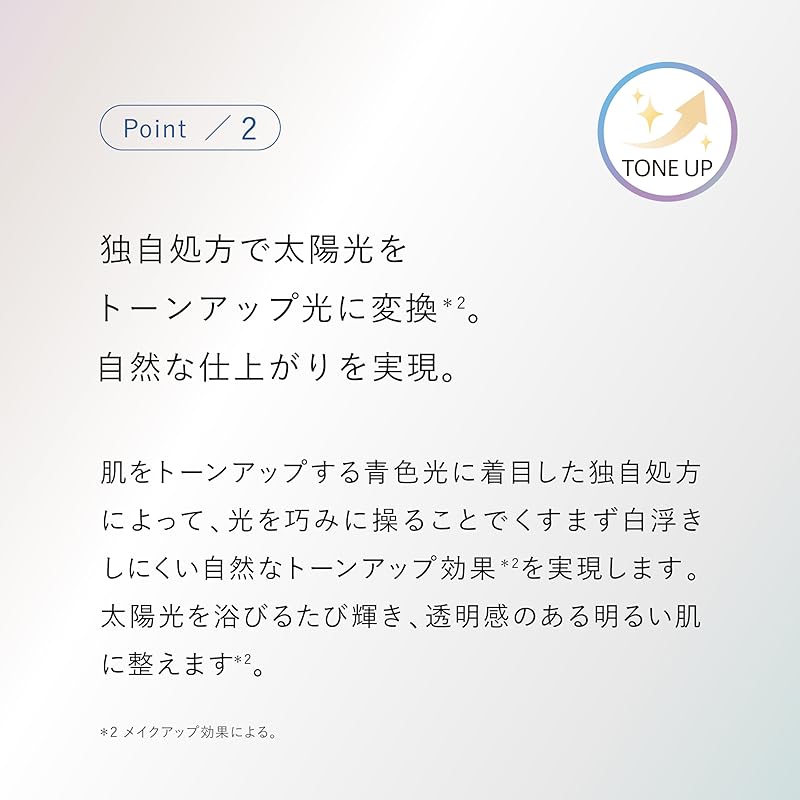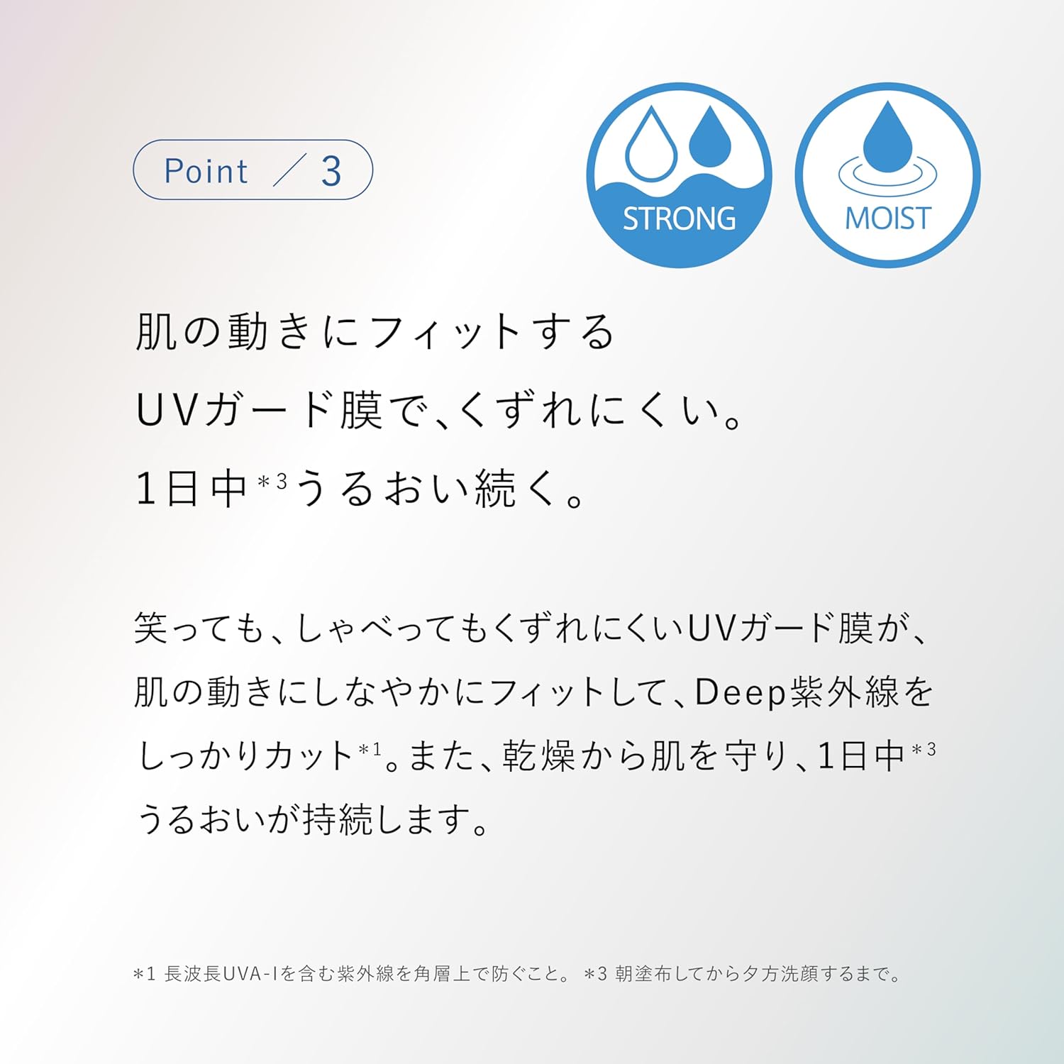 This formulation is rich in nourishing components including Oobana Sarusuberi Leaf Extract and Star Fruit Extract, both of which enhance skin hydration while providing substantial UV protection. The combination of Vitamin E and proprietary UV Action Capsules works synergistically to deliver moisture and combat environmental stressors effectively.