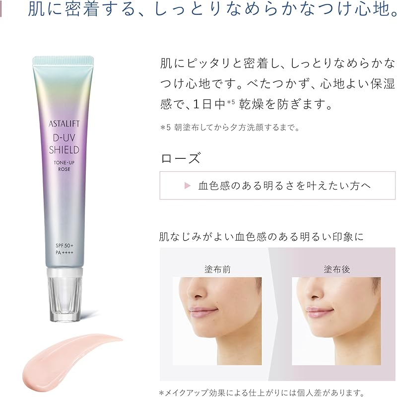 Introducing the ASTALIFT UV Makeup Base (SPF50+ PA++++) D-UV Shield in Rose, exclusively available at our official store! This lightweight 30g primer not only protects your skin from harmful UVA rays but also brightens your complexion with a unique tone-up technology. Infused with a delicate Damask rose scent, it offers a refreshing application experience. Enjoy free worldwide shipping directly from Japan and a 1-month warranty for your peace of mind. Elevate your makeup routine with this essential UV guard, designed for long-lasting hydration and a flawless finish. Your skin deserves the best – order yours today!