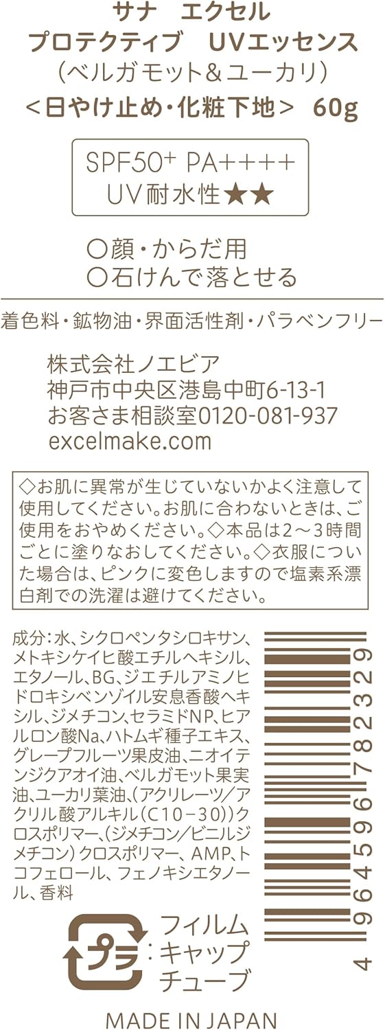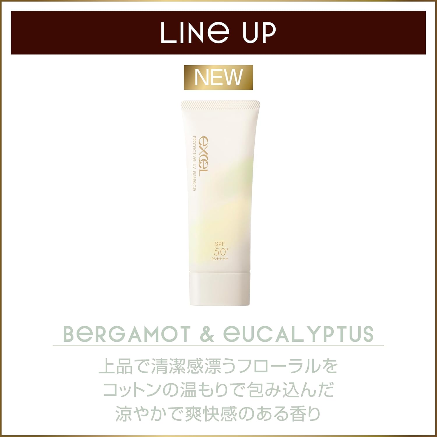 Discover the Excel Protective UV Essence, your go-to facial sunscreen with an SPF of 50+ and PA++++ for ultimate sun protection. Infused with a delightful bergamot and eucalyptus scent, this serum seamlessly blends into your skin, leaving a light and refreshing feel. Suitable for all skin types and waterproof, it's perfect for daily use. Enjoy free worldwide shipping from Japan, and feel secure with our 1-month warranty. Elevate your skincare routine with this beautifully formulated UV protection that washes off effortlessly with soap. Experience the elegance of Japanese skincare today!
