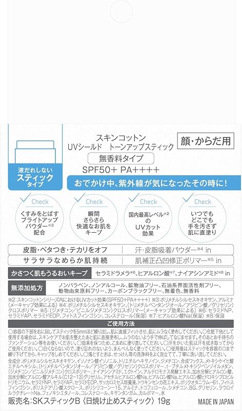 The Skin Cotton UV Shield Tone-Up Stick is designed to provide effective sun protection without compromising comfort. Its key attributes include: