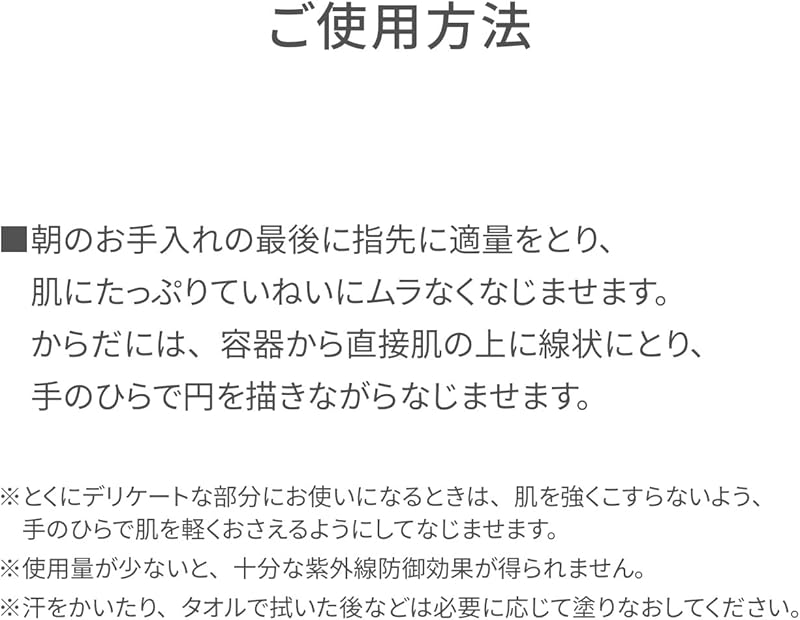 Before use, always refer to the product packaging for any safety warnings and instructions. It’s essential to reapply after sweating or towel-drying to maintain effective UV protection. Remember, using insufficient amounts may compromise the effectiveness of the sunscreen, so ensure that you apply an adequate amount for optimal results.