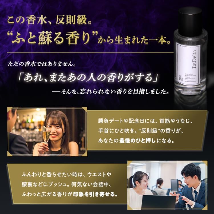 To get the most out of LvDelta Men's Eau de Parfum, apply it strategically to pulse points such as your wrists, neck, and the back of your knees. Beauty influencer Rika Honda suggests applying a light spray on these areas to create a gentle, inviting aura throughout the day. For an added touch of allure, consider pairing it with our hair milk (sold separately) for a scent that remains with you during crucial encounters.