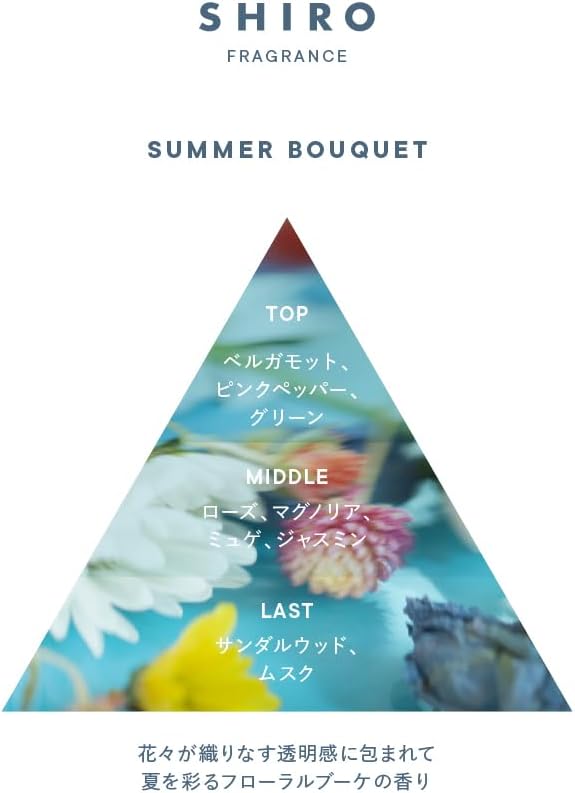 To create a richer, more complex scent, consider layering SHIRO Summer Bouquet with complementary fragrances. Pair it with "White Lily" for an opulent explosion of floral beauty, or mix it with "White Tea" for a refreshing and vibrant experience. For a truly exceptional combination, try layering with "Parisian Shirt," crafted by the same perfumer—this pairing evokes the experience of holding a bouquet at the beach, merging freshness with floral depth, lending a sophisticated edge to your scent profile.