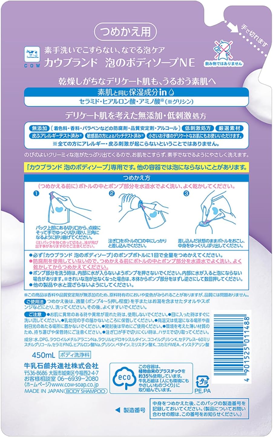Discover the gentle care of Cow Brand Unscented Foaming Body Soap, expertly crafted in Japan. This 450ml refill features a natural, low-irritant formula infused with hydrating ingredients like ceramide and hyaluronic acid, perfect for normal skin types. Enjoy free worldwide shipping and peace of mind with our 1-month warranty. Ideal for adults seeking a moisturizing cleanse without harsh fragrances, this body soap allows you to wash your skin delicately with rich, creamy lather. Elevate your skincare routine with this unique offering from a trusted Japanese seller. Experience the blend of tradition and quality today!