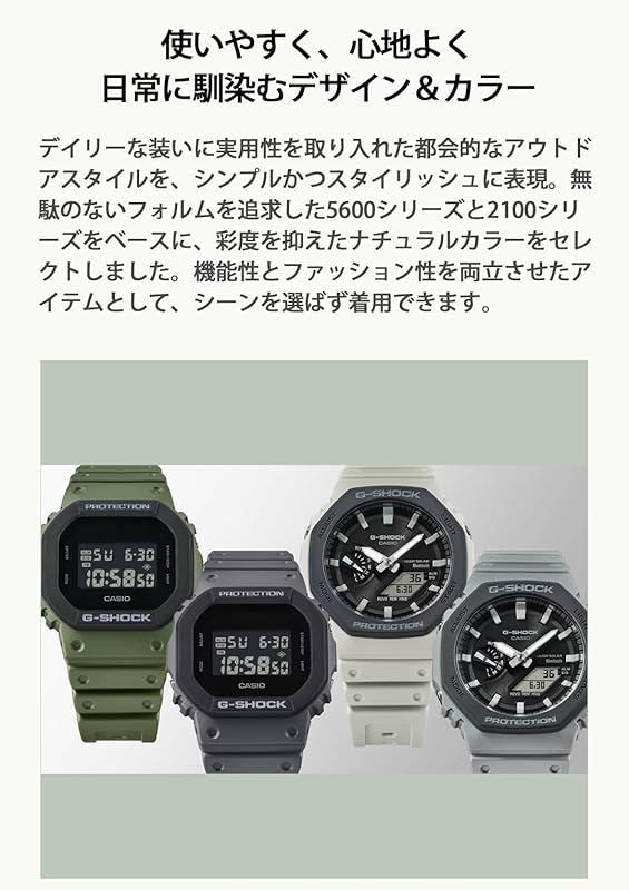 This model draws inspiration from the beloved classic 5600 and the refined 2100 series. The stylish layered bezel and low-tone color scheme provide a sophisticated look that promotes versatility, allowing it to pair seamlessly with a wide range of outfits, from casual wear to semi-formal attire. The innovative dual-color molded bezel enhances the design, marking a significant evolution in G-SHOCK's aesthetic journey.
