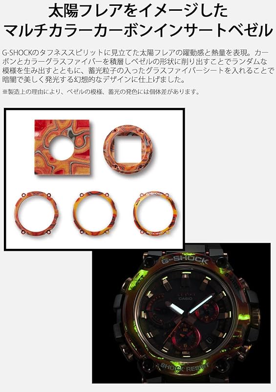 - Unique Bezel Design: Crafted using a multi-layered carbon and fiberglass composite, each bezel is one-of-a-kind, mimicking the explosive energy of a solar flare.