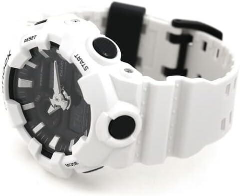 The GA-700-7ADR boasts a striking black and white design that marries style with functionality. Its robust case is designed using CASIO’s cutting-edge resin molding technology, presenting a textured aesthetic that resonates with both elegance and toughness. The prominent G-SHOCK front button, located at the 6 o'clock position, is emblematic of the brand’s dedication to durability and is integrated seamlessly into the watch's overall design.