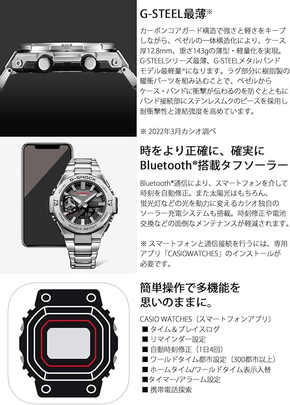 If you are considering alternatives, note that the G-STEEL series stands out due to its innovative use of materials combining metal and resin, resulting in both toughness and style. While there are numerous smartwatches available, the GST-B500D-1AJF’s focus on durability and classic design makes it an exceptional choice for those who value both function and form. Additionally, its solar technology and Bluetooth® functionality set it apart from traditional analog watches, offering a modern solution for contemporary lifestyles.