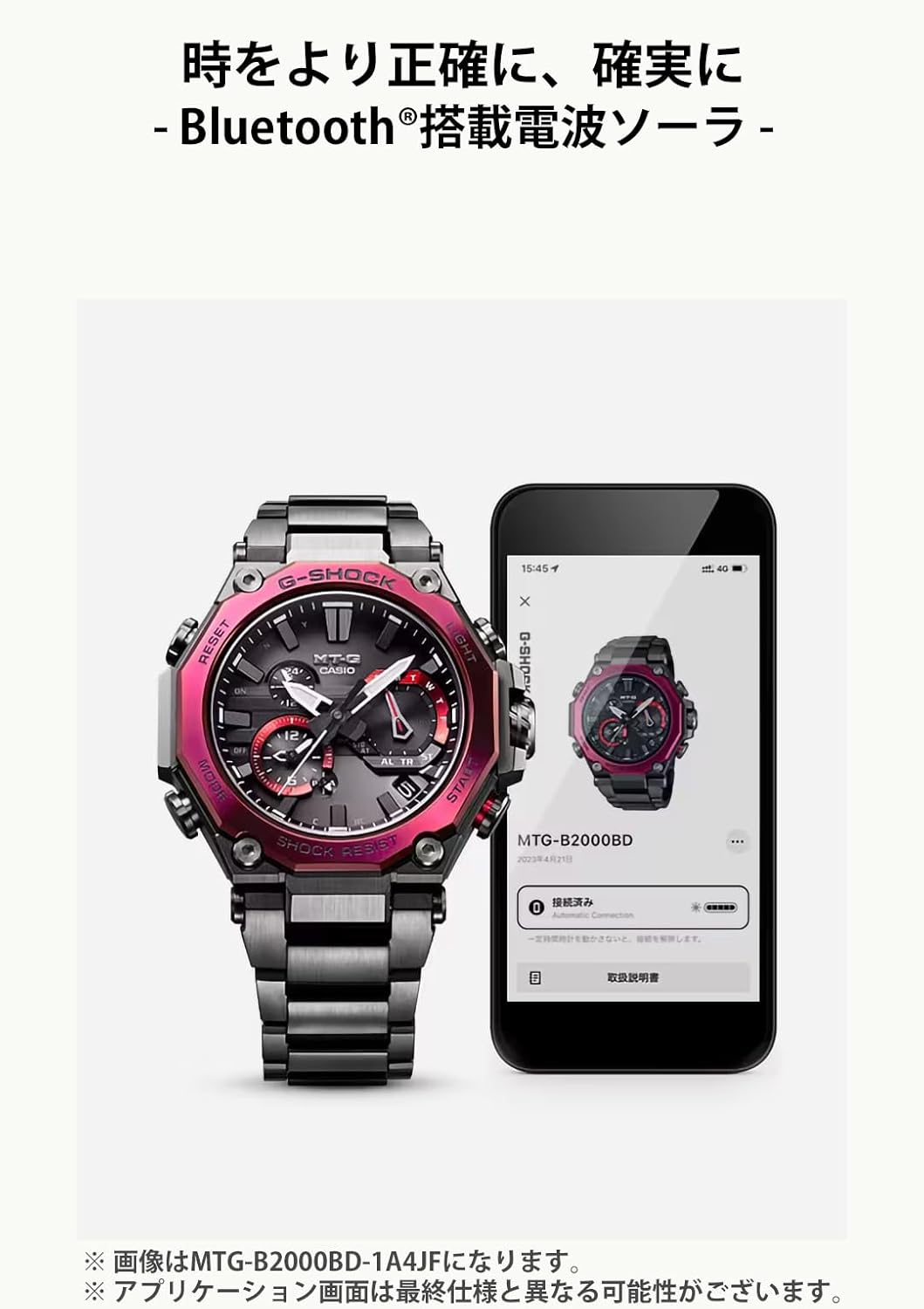 Constructed with a unique monocoque case crafted from carbon fiber reinforced resin, the MTG-B2000 is engineered for lightweight comfort without sacrificing strength. The carbon bezel, made from composite layers of carbon fiber and glass fiber, is approximately 77% lighter than conventional stainless steel, making this watch exceptionally comfortable for everyday wear. The striking red accents on the fiberglass layer enhance its aesthetic appeal, aligning perfectly with G-SHOCK’s established brand identity while providing a contemporary flair.