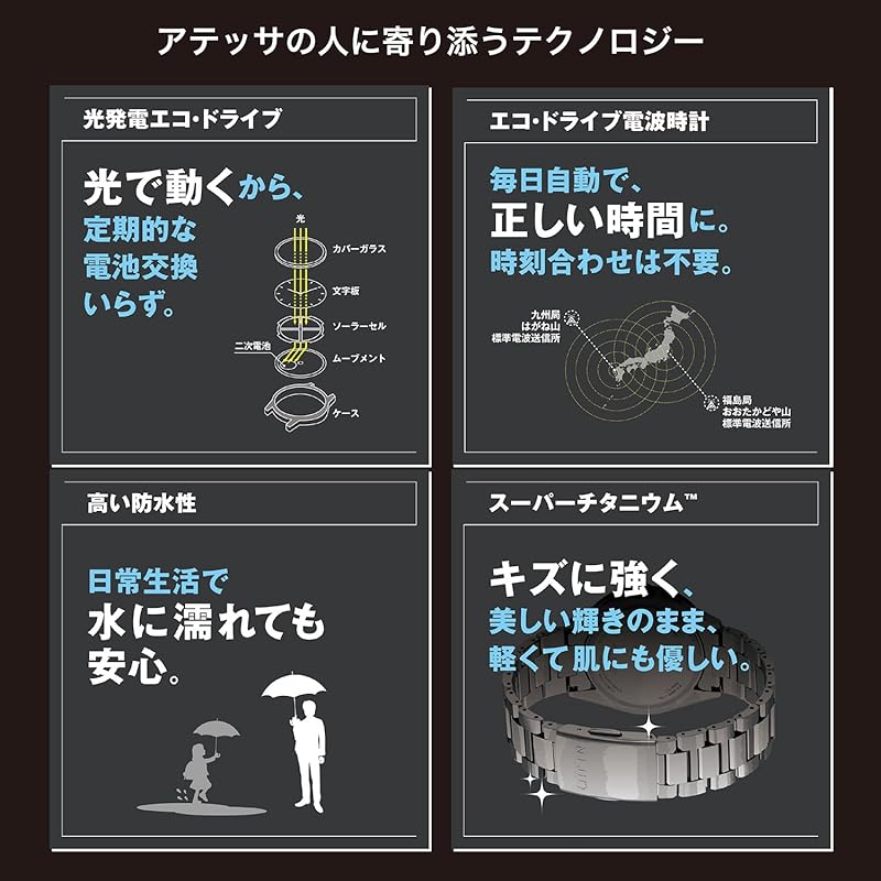 Crafted from high-quality titanium, the Attesa is not only lightweight but also exceptionally durable, ensuring it withstands the test of time. Every aspect of this watch reflects meticulous craftsmanship and precision engineering. From the elegantly polished finish to the flawless movement, this watch signifies superior quality, making it an ideal choice for discerning watch enthusiasts. Each component is designed with precision, reflecting Japan's renowned reputation for exquisite watchmaking.