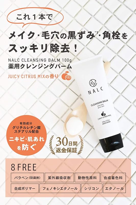 Discover the NALC Cleansing Balm—a versatile solution for all skin types, particularly beneficial for sensitive and acne-prone skin. With its unique formula, this medicated cleansing balm performs seven functions, including makeup removal, exfoliation, and hydration, all while being gentle and free from harmful additives. Enjoy free worldwide shipping directly from Japan, and trust in a product backed by a one-month warranty. Breathe in the refreshing Juicy Citrus Blend scent as you indulge in a cleansing experience designed to leave your skin feeling clean, refreshed, and radiant. Perfect for a hassle-free skincare routine!