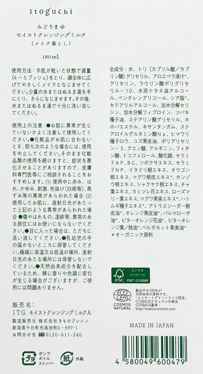Discover the exquisite touch of nature with Itoguchi's Midori Mayu Moist Cleansing Milk. Crafted from 100% natural-derived ingredients, this luxurious cleansing milk is an essential addition to your skincare regimen. Its innovative formula not only effectively removes makeup and impurities but also delivers remarkable hydration, leaving your skin feeling velvety soft, rejuvenated, and radiant. Designed for all skin types, this cleansing milk embraces the philosophy of gentle yet effective skincare.