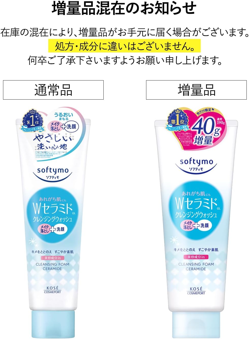 Softymo Kose Cleansing Wash (Ceramide) - Makeup Remover and Face Cleanser - 190g - Set of 2 with Bonus
