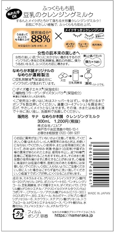 Discover the nourishing power of the なめらか本舗 クレンジングミルク, a luxurious 300mL cleansing milk designed for adults with normal skin. Infused with 88% beauty serum ingredients, this organic formula ensures gentle yet effective removal of even waterproof makeup. Enjoy the convenience of free worldwide shipping directly from Japan, along with a 1-month warranty for peace of mind. Ideal for daily use, this fragrance-free cleansing milk delivers hydration and moisture, making it a must-have in your skincare routine. Experience the essence of Japanese skincare and achieve a flawless complexion effortlessly!