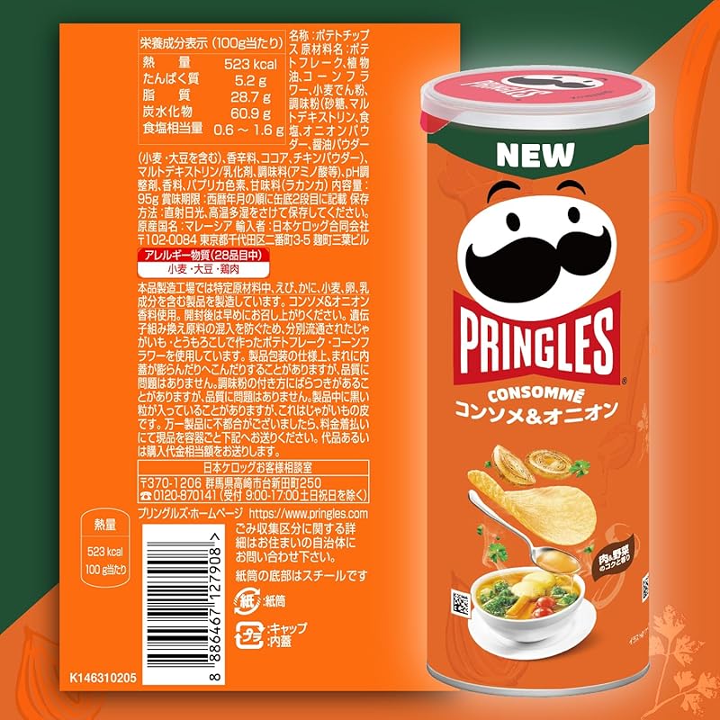 Discover the delicious taste of "Kellogg's Pringles Consommé & Onion" in a convenient pack of 8 (95g each) — now available for purchase with free worldwide shipping directly from Japan! This savory snack offers a rich blend of meaty and vegetable flavors perfect for pairing with your favorite beverages, whether it's an alcoholic drink or soda. With a high rating of 4.3 stars from satisfied customers, this tasty treat is a must-have for snack lovers. Plus, enjoy peace of mind with a one-month warranty. Don't miss out on this classic Japanese delicacy!